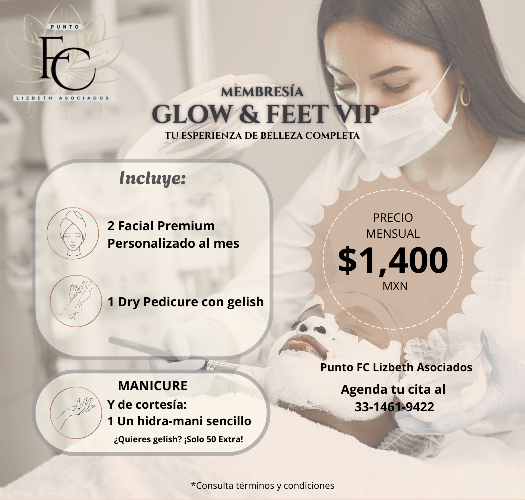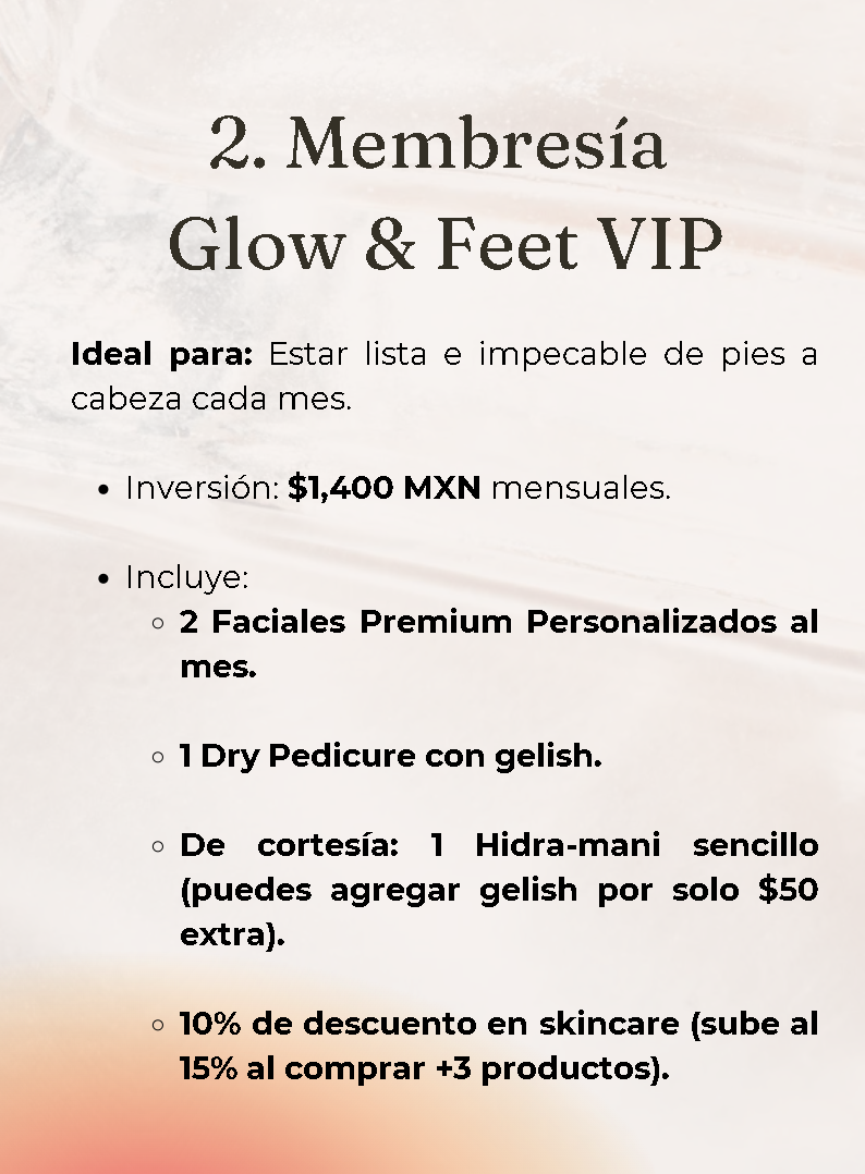 Lleva tu rutina de cuidado personal al siguiente nivel con nuestra Membresía Glow & Feet VIP. Esta opción está diseñada para quienes desean lucir impecables y radiantes cada mes, combinando lo mejor en cuidado facial y servicios especializados para manos y pies.