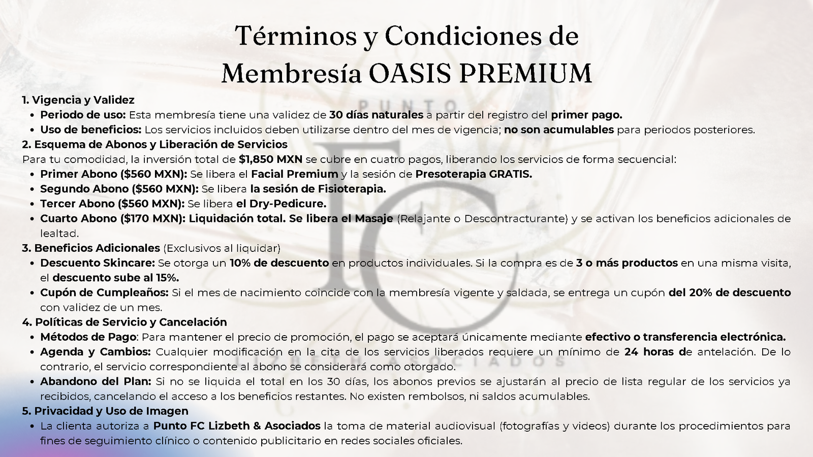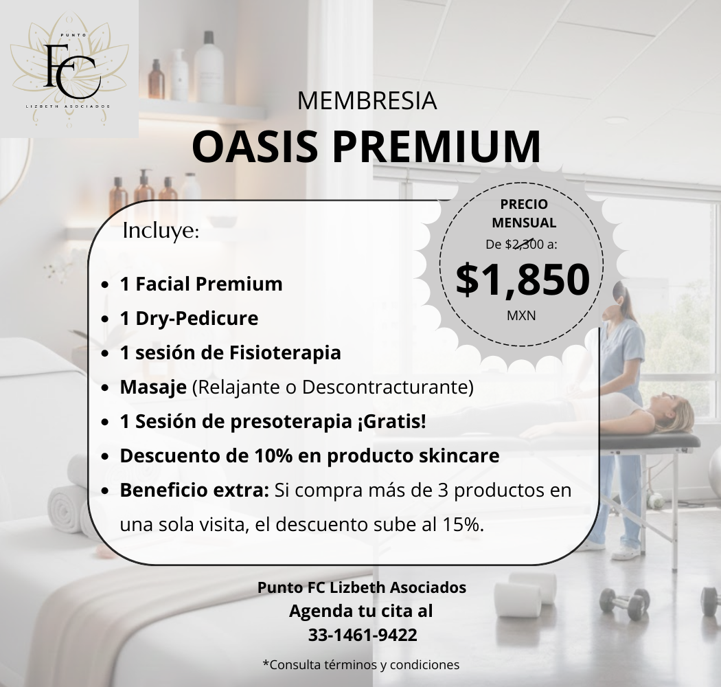 Descubre el equilibrio perfecto entre belleza y bienestar integral con nuestra membresía Oasis Premium. En Punto FC Lizbeth Asociados, hemos diseñado este programa exclusivo para quienes buscan un cuidado preventivo y correctivo de pies a cabeza, garantizando una experiencia de lujo a un precio preferencial.