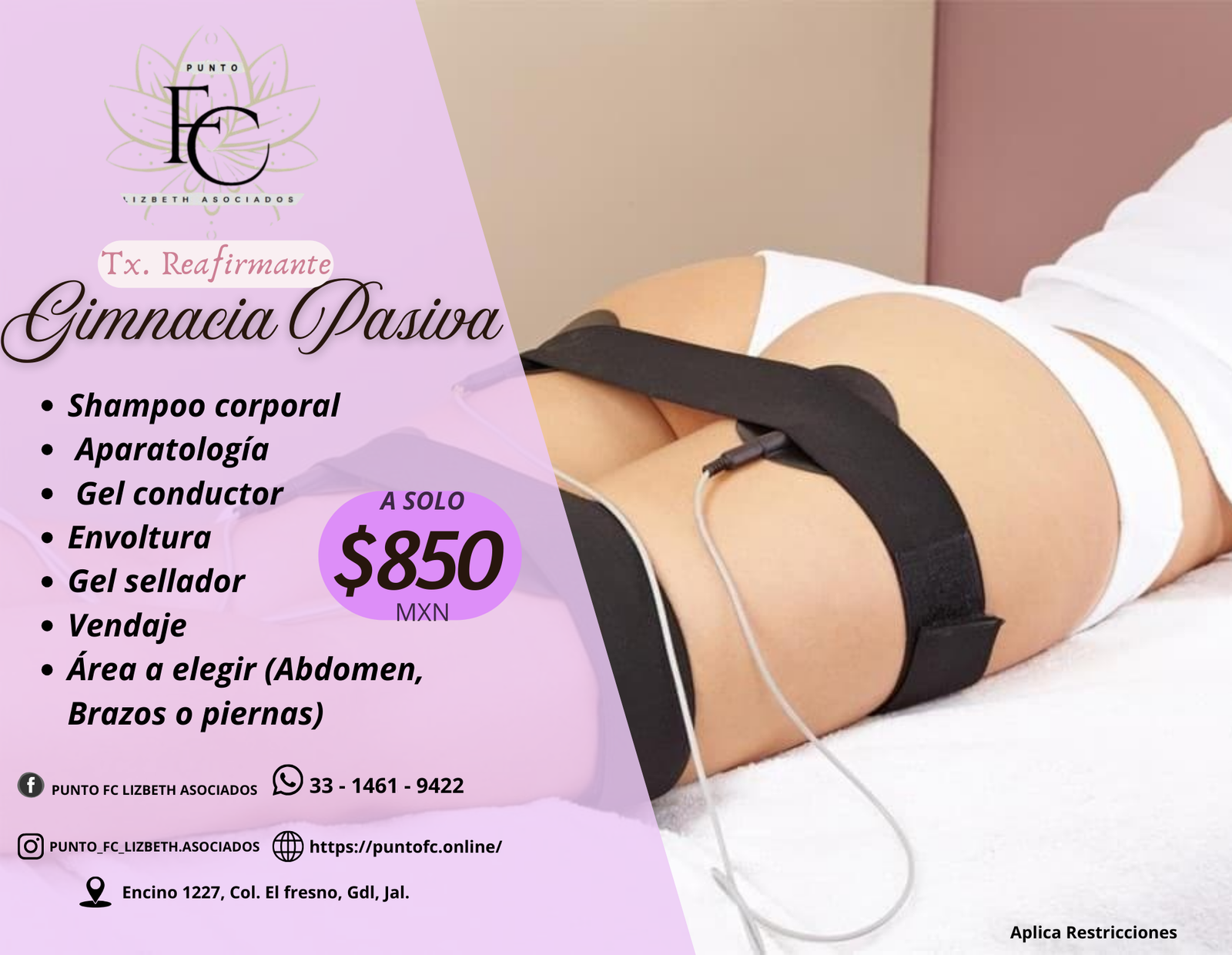 ¿Quieres fortalecer tus músculos y reafirmar tu piel mientras te relajas? La Gimnasia Pasiva en Punto FC es un tratamiento estético y terapéutico que utiliza impulsos eléctricos de baja frecuencia para generar contracciones musculares controladas.